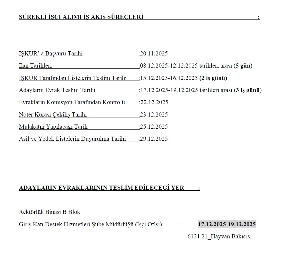 08.12.2025 Tarihinde Türkiye İş Kurumu sayfasında yayınlanan hayvan bakıcısı alımı ilanına ilişkin iş akış ve evrak kontrol süreçleri ekte yer almaktadır.